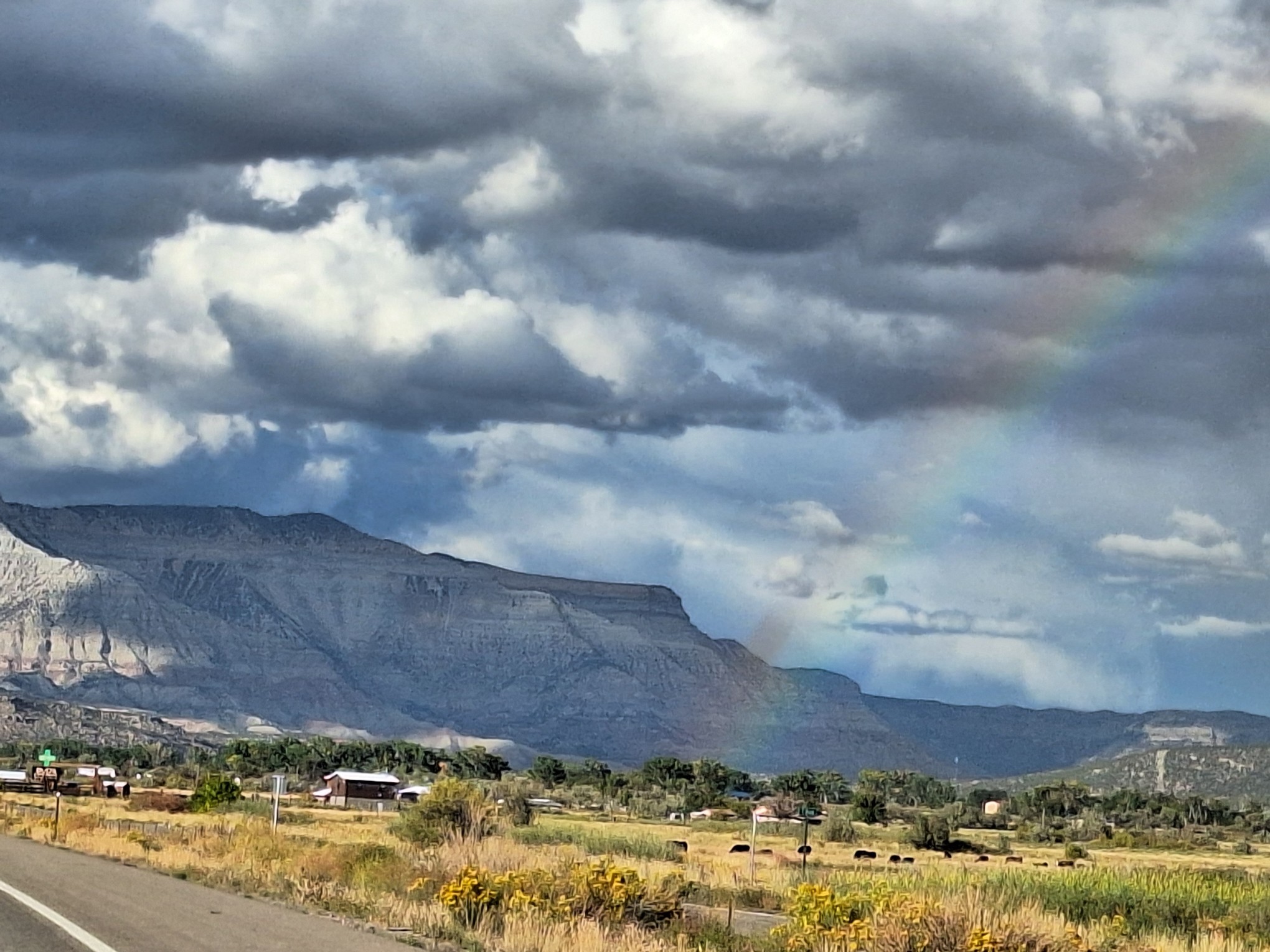 I was presented with this rainbow today on my way home through the rocky mountains. I traveled about 550 miles today and it rained 400 miles of the trip. ๐
