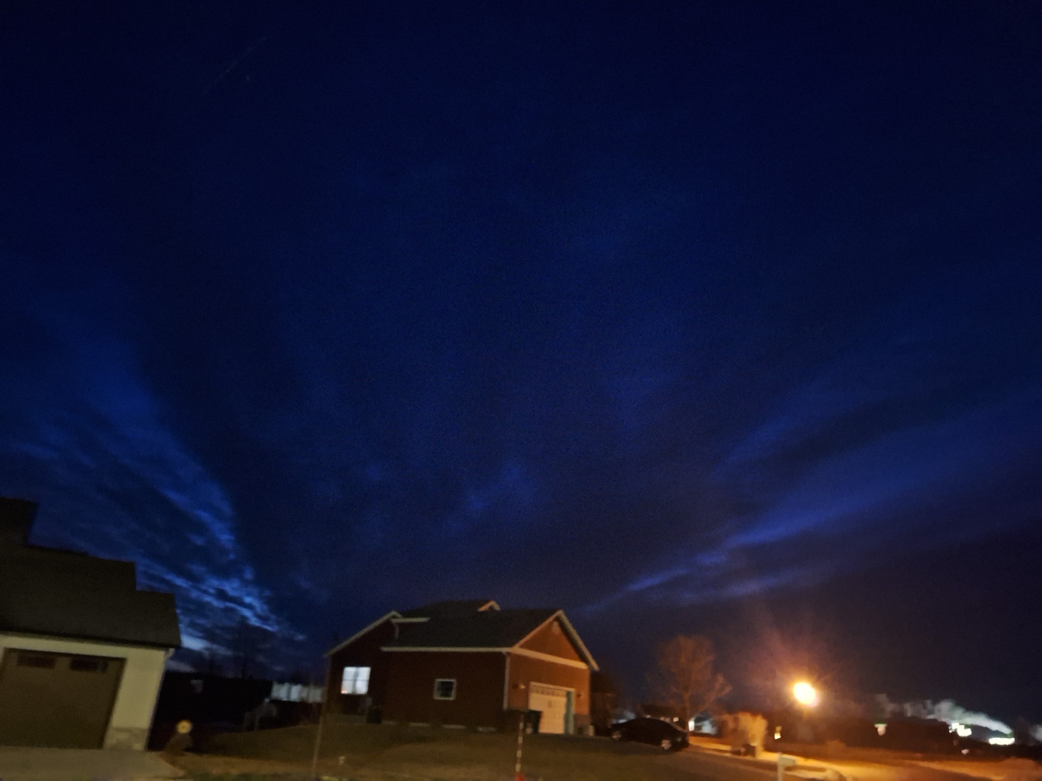 I looked out my window at 5 am and even with the light polution the sky was dancing! It is very faint in the picture the colors are magenta and violet on the color wheel. Magenta is a facinationg color. It is made of consistant intensities of red and blue. Fire and water dragons dancing in the sky? π